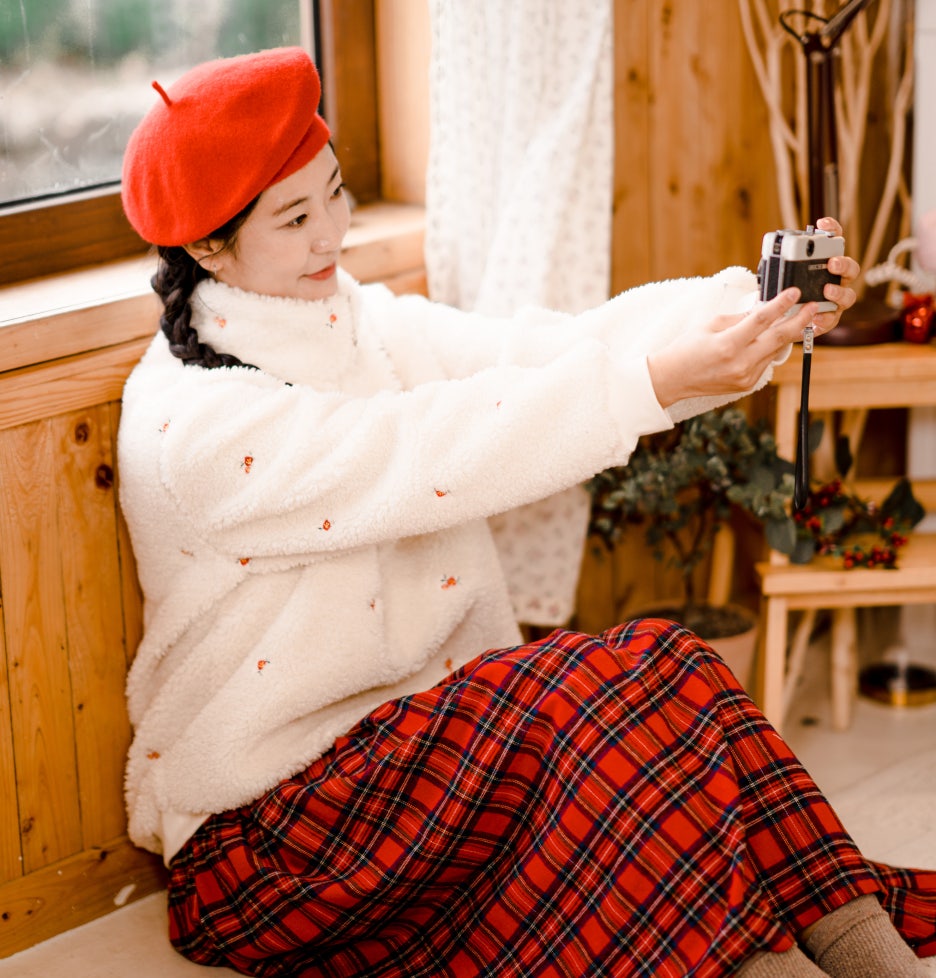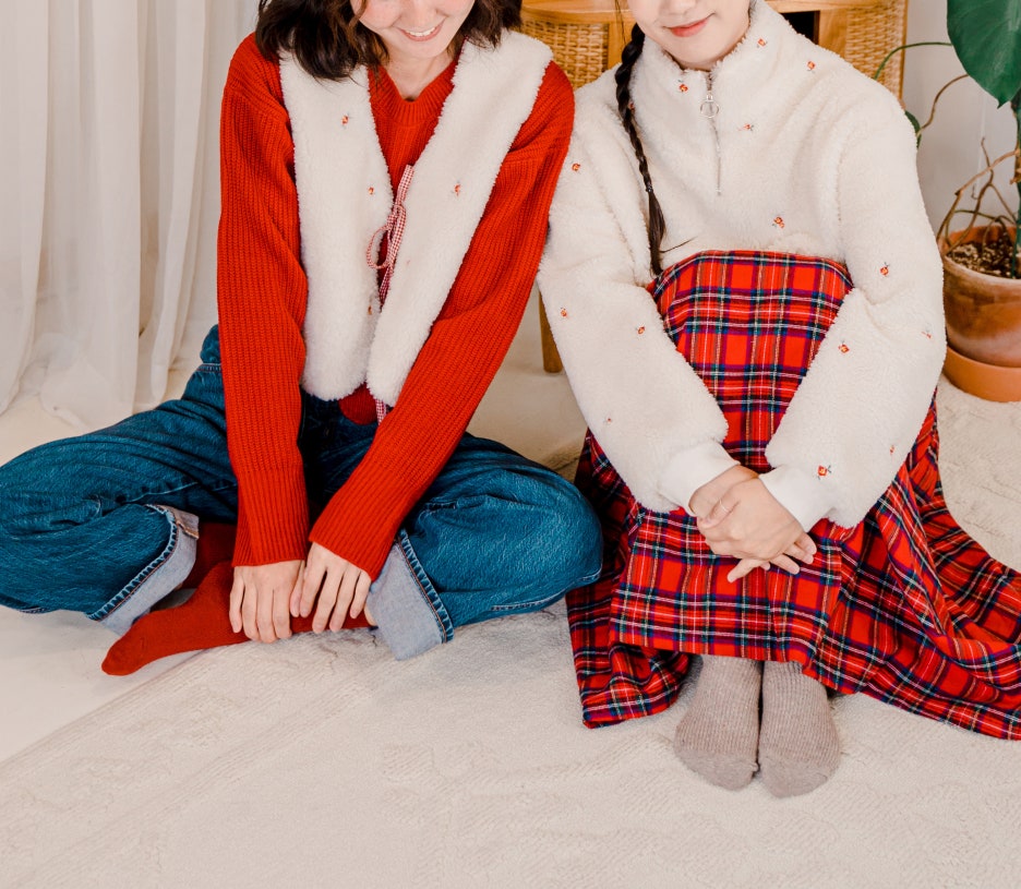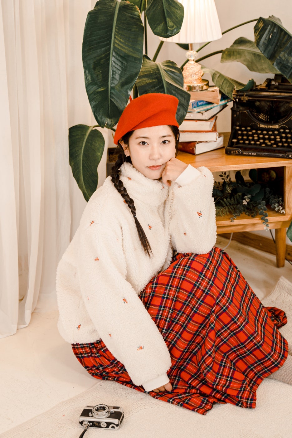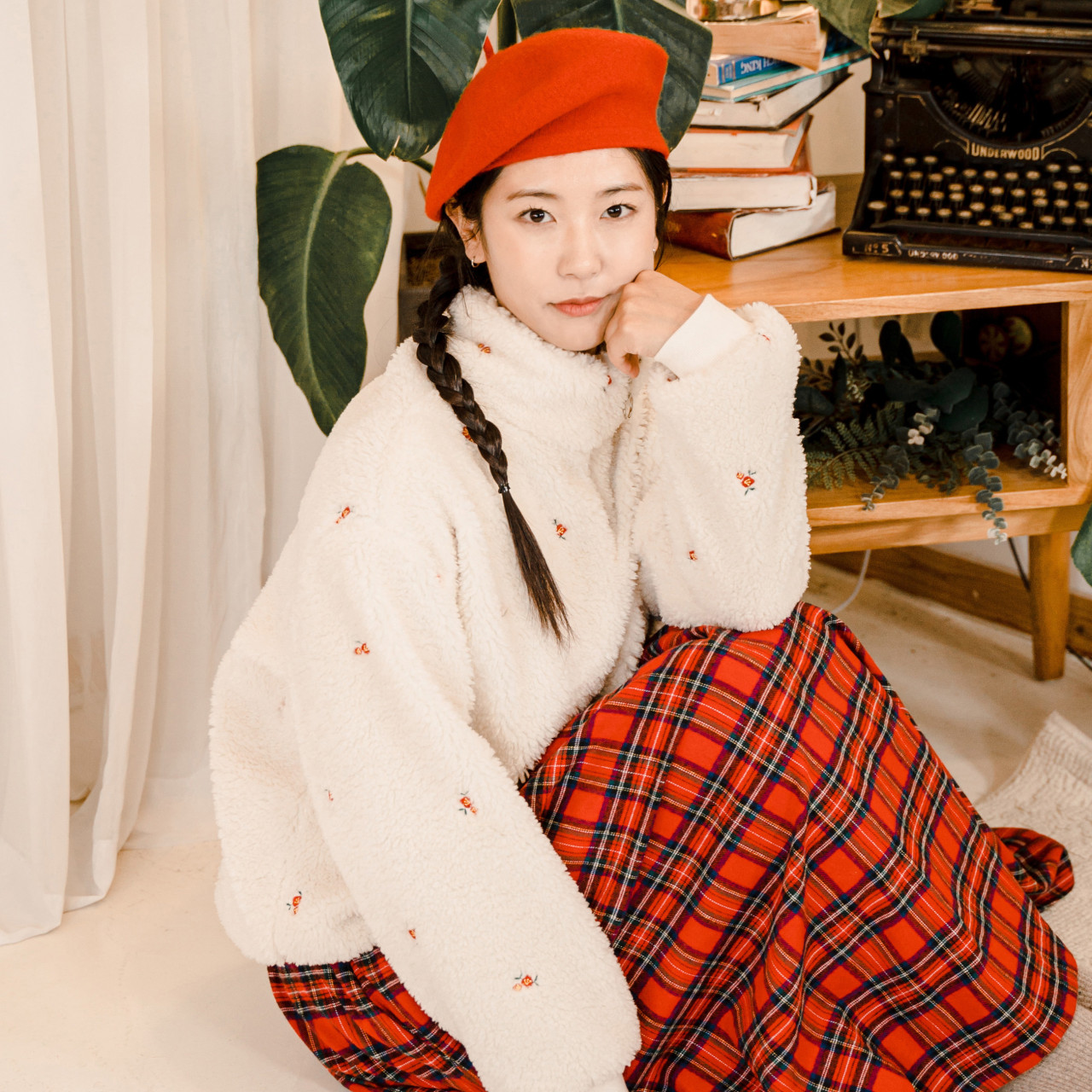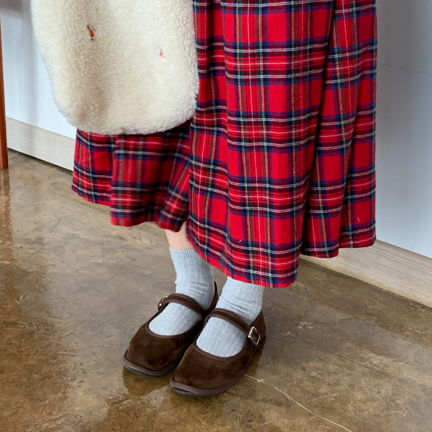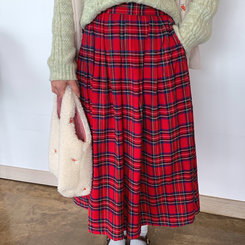 겨울 시즌과 어울리는 체크 패턴과 주름 플레어 라인으로